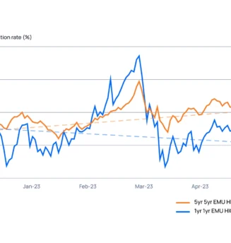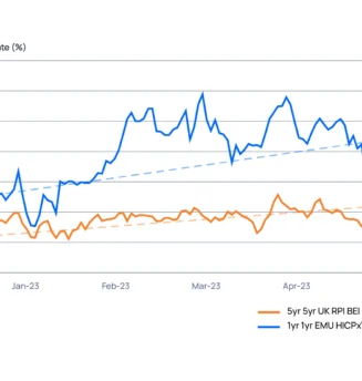 As widely predicted, the BoE hiked rates by 0.25% at the May ’23 Monetary Policy Committee (MPC) meeting and many economists are expecting another hike in June. The reality behind this is that UK Inflation remains stubbornly high and as the MPC minutes stated, “risks around the inflation forecast are skewed significantly to the upside” 1 . Inflation swaps data from Parameta Solutions shows that swap markets are still pricing in high levels of inflation for some years to come. The chart below shows the expectation of the annual inflation in one year’s time and the five-year average of inflation in the UK starting in five years’ time, implied from ICAP zero-coupon inflation swaps pricing. We should note that UK Inflation swap and bond markets use RPI rather CPI as a reference point, which makes it hard to compare the market’s expectation directly with the BoE’s CPI based 2% inflation target, nevertheless sentiment is clear.
